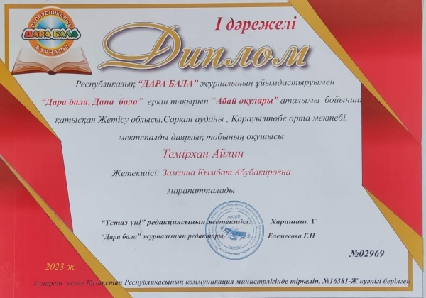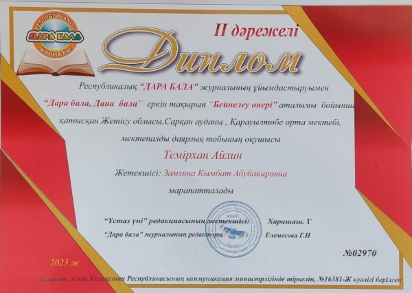 2. Республикалық "Дара бала" журналының ұйымдастыруымен "Дара бала,Дана бала" еркін тақырып "Бейнелеу өнері" аталымы бойынша ІІ дәрежелі дипломмен марапатталды. жетекшісі: Қ.Замзина. Айлин бүлдіршінімізге сәттілік тілейміз!