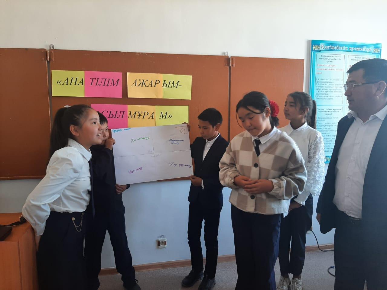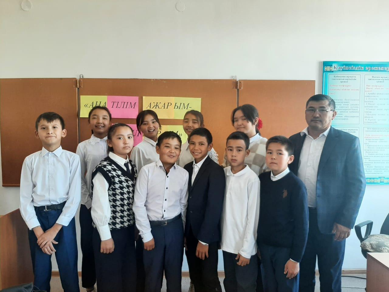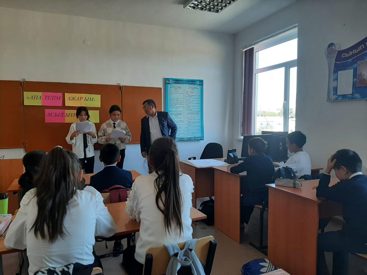 "Ана тілім ажарым-асыл мұрам"атты Тіл апталығына орай өткен тәрбие сағаты. Мақсаты:ана тілге деген құрмет. Тіл тазалығын сақтау,мәдениетті сөйлеуге,мемлекеттік тіліміздің мәртебесін көтеру. Осы орайда балалар 2 топқа бөлініп,өлең шумақтарды мәнерлеп оқыды. Ұйқасын тап деген ойын барысында айтылған мақал -мәтелді жалғастырды. Өз ойларын қорытындылап"Тіл мәртебесі"тақырыбына постер құрап қорғады. 6 сынып жетекшісі Тоғанбаев Қизат
